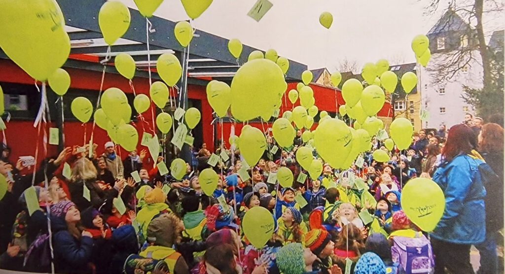 Genau vor zehn Jahren zogen alle Schülerinnen und Schüler, Lehrkräfte, OGS-Personal und Eltern mit hunderten sattgrüner Luftballons von der Grundschule Ost am Weyersbusch zum neuen Standort Am Vogelsang. Seit dem 11.01.2016 heißt unsere schöne Schule nun Waldschule, weil der Neubau direkt am Waldrand errichtet wurde. Die offizielle Einweihung mit Programm und einem Grußwort des damaligen Bürgermeisters Rainer Bleek fand am 01.07.2016 statt.
